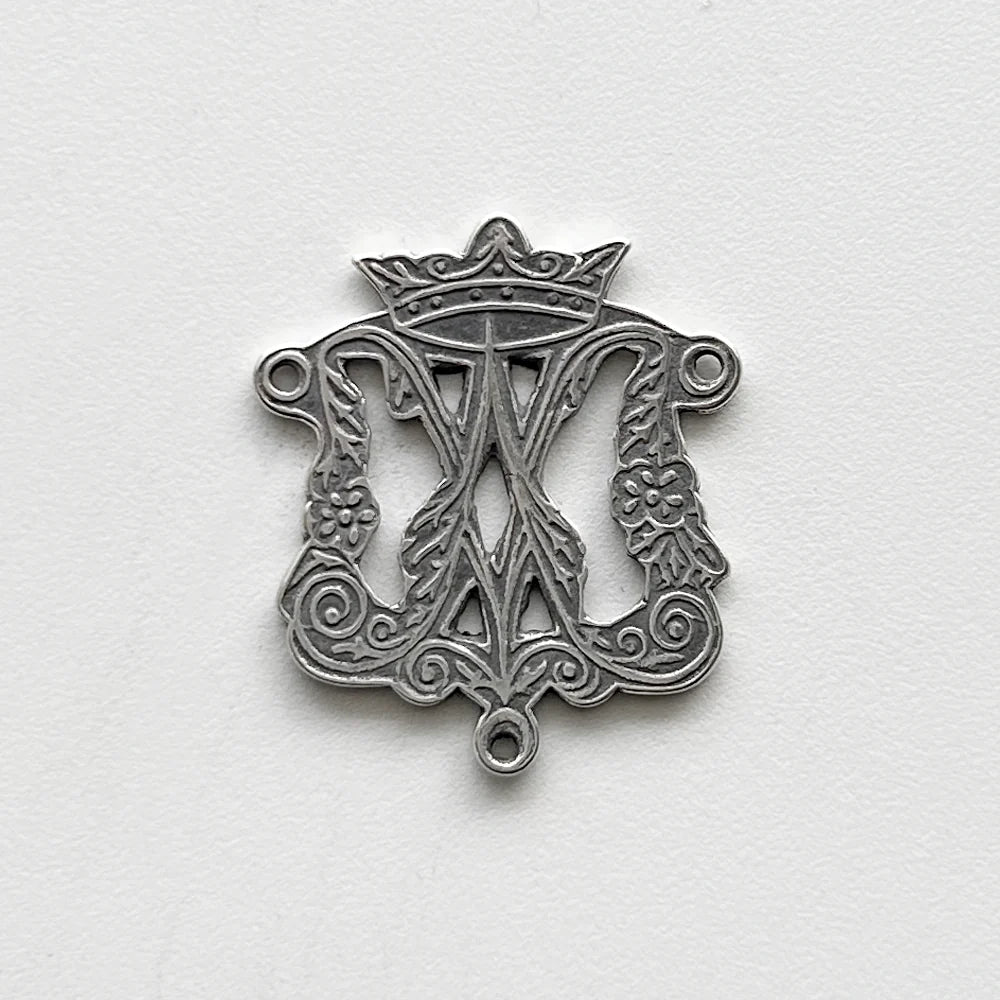 This striking rosary center features the classic Auspice Maria monogram—an intertwined “A†and “M†beneath a regal crown, representing the Latin phrase “Auspice Mariaâ€, meaning “Under the protection of Mary.†This ancient Marian symbol is a visual prayer invoking Our Lady’s guardianship and maternal care.
