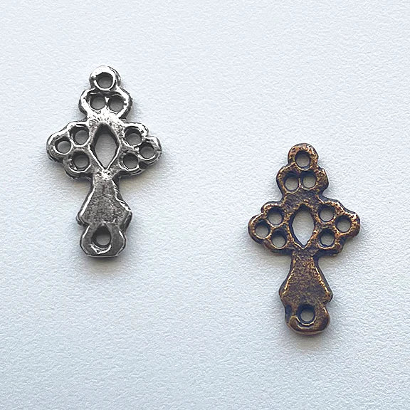 The arms of the cross pendant are short and slightly flared, curving outward with a natural, flowing rhythm. Both the top and bottom of the Cross Link Connector feature a larger round opening, making it ideal for use as a connector between different elements in rosaries, prayer necklaces, or artisan jewelry designs.