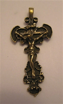 This 2 inch (51 mm) crucifix pendant and rosary crucifix is an exact replica of a highly detailed antique rosary model, available in sterling silver or gold bronze. The design reflects ornate European styling, likely Baroque or Rococo, with bold forms and decorative elements.