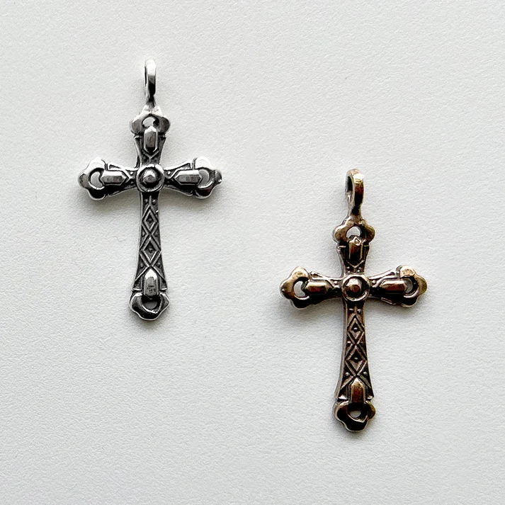 This is a refined and symbolic Diamond Cross pendant, measuring 1 1/4 inches (approximately 32 mm). It is an exact replica of an antique piece, available in your choice of sterling silver or gold bronze.