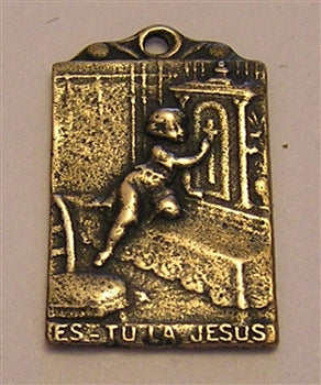 The front of the medal features a tender depiction of a young child kneeling before a closed door, reaching up to knock—an evocative image representing the innocence of faith and the heartfelt search for Jesus. The inscription at the bottom reads "JESUS TULLA JESUS," a loving, childlike plea for the Savior's presence. The background shows delicate architectural details and a softly rendered environment, capturing a scene of humble devotion and quiet hope. The style of this medal echoes elements of early 20th-century devotional realism, focusing on emotional expression and narrative clarity.