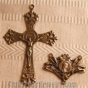 art nouveau rosary parts, double nimbus crucifix, calla lily rosary center, large rosary components, sterling silver rosary supplies, gold bronze antique replica