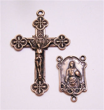 This rosary parts set features a finely detailed Gothic-style crucifix and a matching Sacred Heart of Jesus centerpiece, both faithfully recreated as exact replicas of antique pieces in a traditional European devotional style.