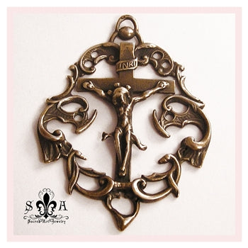 Keywords: angelic crucifix pendant, antique openwork crucifix, sterling silver rosary crucifix, gold bronze crucifix, baroque catholic crucifix, vintage religious jewelry, large ornate crucifix