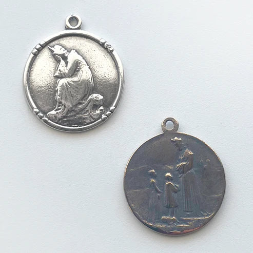 This reverent Our Lady of La Salette Medal measures approximately 1 1/4 inches (32 mm) and is an exact replica of an antique or vintage medallion, available in sterling silver and gold bronze. This sacred medallion commemorates the apparition of the Blessed Virgin Mary at La Salette, France, in 1846, a message of repentance, hope, and reconciliation.