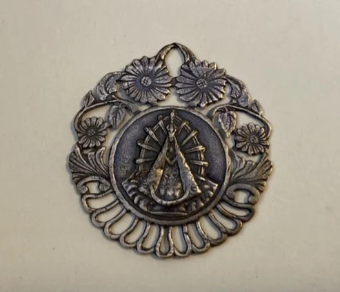This Our Lady of Luján medal measures 1 1/2 inches (38 mm) and is an exact replica of an antique Catholic medallion, available in sterling silver or gold bronze. The medal features a scalloped and floral openwork border with finely cast details, combining sacred imagery with ornamental design.