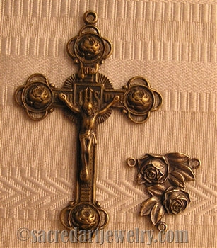 This rosary parts set features an ornate JHS crucifix adorned with roses and a matching rose motif rosary centerpiece, crafted as exact replicas of antique pieces.