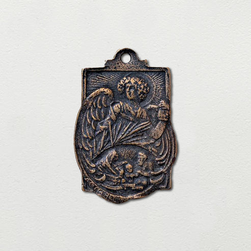 On the front side, the medal portrays Archangel Gabriel in a flowing robe, tenderly watching over two sleeping children, embodying his traditional role as the guardian of purity, innocence, and divine communication. Above the figures, a radiant halo signifies the celestial light of protection and heavenly guidance. The background features ornate, stylized clouds and rays, suggestive of an Art Nouveau influence, popular during the late 19th and early 20th centuries.