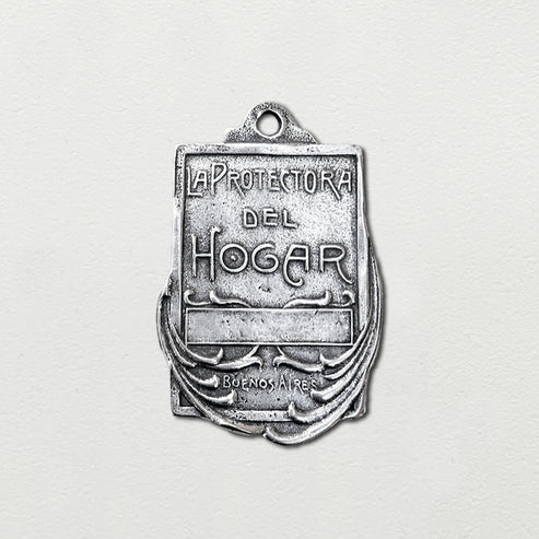 The reverse side of the medallion bears the inscription "La Protectora del Hogar" ("The Protector of the Home") with an elegant, flowing font framed by graceful botanical elements, and marked with "Buenos Aires" at the bottom, hinting at its South American origins. The design offers a heartfelt invocation for divine safeguarding of the household.