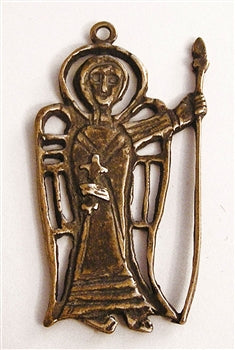 The front of the St Michael medallion features a stylized depiction of Saint Michael the Archangel, rendered in a form reminiscent of early medieval and Romanesque sacred art. Saint Michael stands in a commanding posture, holding a staff or spear in his right hand and a shield marked with a cross in his left. His figure is framed by simplified, openwork angelic wings and a nimbus halo, emphasizing his heavenly mission. The design focuses on sacred symbolism rather than naturalistic detail, conveying the eternal authority and spiritual light of the Archangel.