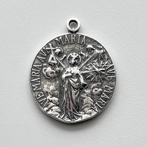 The design of the Step Back Satan medal reflects the influence of late 19th to early 20th-century European devotional art, with strong symbolic imagery, fine relief detailing, and a layout intended to inspire both awe and trust in Mary’s spiritual authority.