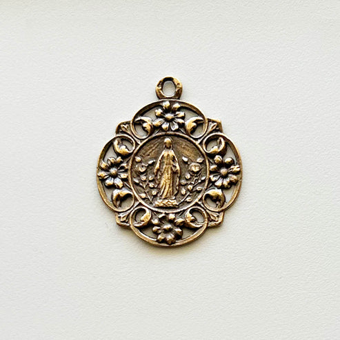 This Virgin Mary medal measures 1 inch (25 mm) and is an exact replica of an antique Catholic medallion, available in sterling silver or gold bronze. The medal is cast with clarity and care, preserving the original relief and ornamental structure.